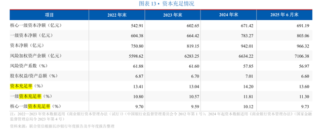 2023年-2024年,该行资本充足率为13.04%、14.2%;一级资本充足率10.57%、11.81%;核心一级资本充足率9.59%、10.12%。2025上半年末,资本充足率、一级资本充足率、核心一级资本充足率为13.6%、11.3%、9.73%,截止三季度末进一步提至14.23%、11.88%和10.24%。