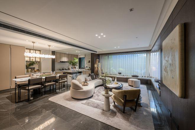 但在这里,转角处的木饰面圆柱造型,整面的皮革软包衣柜,晶莹剔透的餐边柜,厨房与餐客厅衔接的大理石岛台,无一不是交付标准。