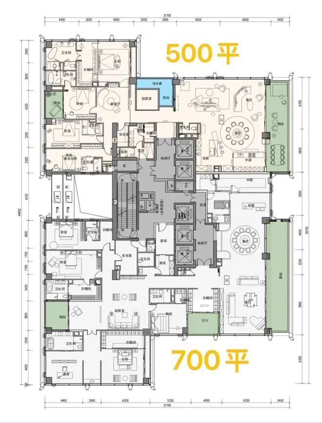 700㎡大平层,客厅约13.5米进深、开间约11米。阳台开间约15.5米,5房(4套房)