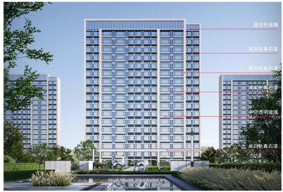 根据项目效果图来看,项目的外立面为蓝灰色玻璃、深灰色真石漆、米白色真石漆、浅灰色真石漆、中空透明玻璃、米白色真石漆。