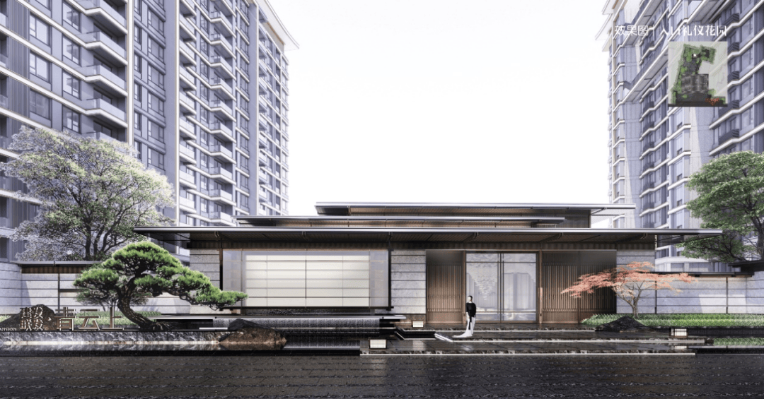 入口松石相抱,结合特色跌水水景、精选造型树等,再加上入口三级台阶的设计,营造出更具品质感、尊贵感的江南大宅形象。