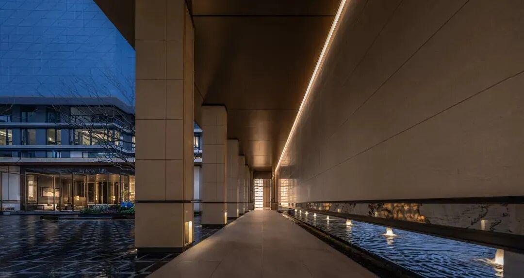 水畔林荫之间,设有休憩座椅,其面料选用定制材料,即使日晒雨淋也不会影响其功能;跌水处则以金属与石材精工衔接,一体成型的设计令水流均匀而柔顺,尽显优雅细节与匠心考量。
