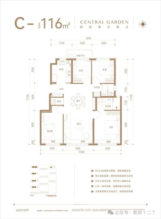 116平米四室两厅两卫,中间户独立家政空间,次卫三段式分离,主卧套房飘窗