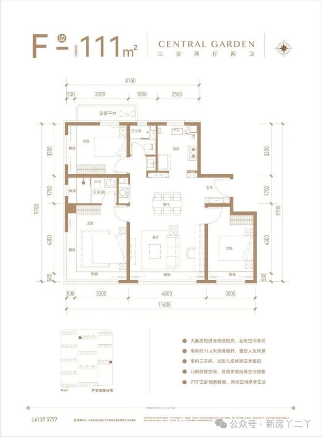 111平米三室两厅两卫,边户南向11.1米超大面宽,4.8米横向宽厅,270°环幕飘窗