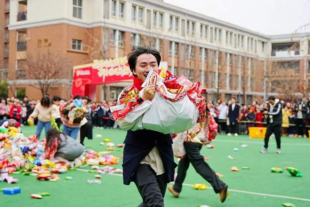 待哨声一响,老师们如离弦箭矢迅速冲向“零食山”,或双手并用,或兜装身抱,各自使出浑身解数将零食运回班级球框。他们在欢笑声与加油声中往返穿梭,为了班级的“零食余额”奋力拼搏,为了班级孩子们的甜蜜福利全力冲刺。