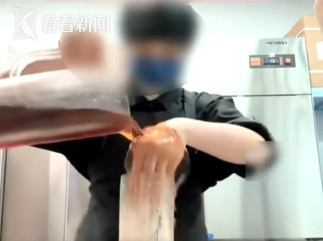 视频显示:一女子身穿霸王茶姬工作服,未佩戴手套,将冰块砸碎后徒手捡起放杯中,徒手捏挤柠檬片,又将手伸入杯中,把红茶沿手臂倒入,直接用手在杯内搅拌饮品等。
