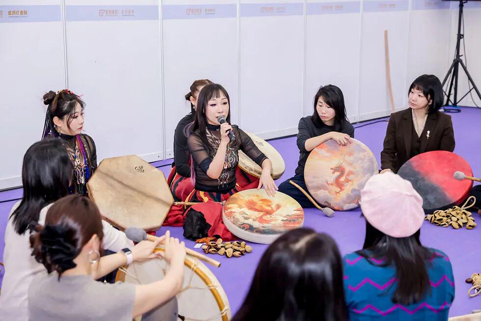 主题为“乐器在疗愈经济中的需求和应用”的疗愈乐器论坛,出席论坛的有著名埙演奏家、音乐剧《琵琶行》“白居易”扮演者吴题;广州梵音颂钵主理人、颂钵鉴定收藏家双龙;龙吟太和负责人、欧美国家疗愈乐器出口商之一薛烁;漢旗乐器设计师许锴。