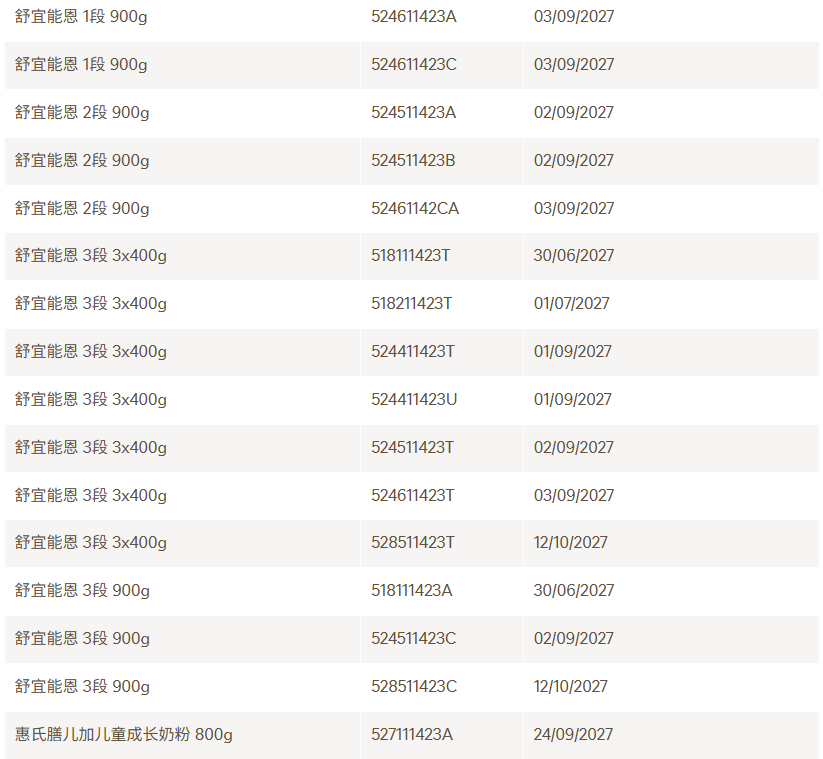 截至目前,此次受到影响的共计4个品牌,分别是力多精、铂初能恩、舒宜能恩和惠氏膳儿加儿童成长奶粉。需要召回的共计30个批次产品:
