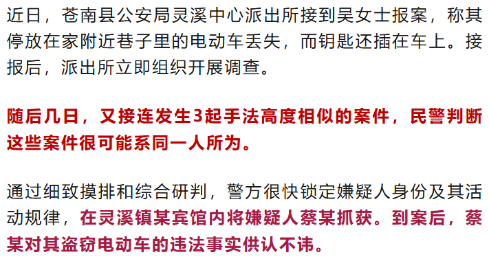 苍南县灵溪镇有4位电动车车主,都因一时粗心,停车后忘拔钥匙,结果车子被“顺手牵羊”。所幸警方迅速行动,成功破案并将所有被盗电动车追回。