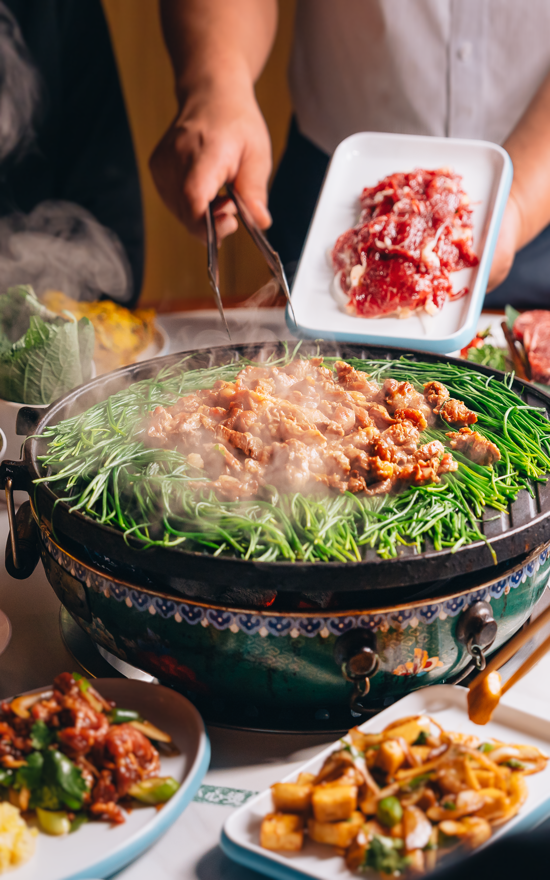 一方水土养育一方植物,来自内蒙的沙葱,入口清脆,有一股类似韭菜却更温和的独特香气。与之搭配的鲁西黄牛肉牛肋条,全部做了去骨处理,烤出来外焦里嫩,入口也不用担心有骨头。