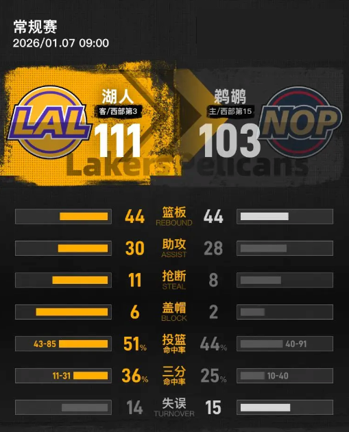 北京时间1月7日星空报道体育资讯,据悉NBA常规赛,客场作战的湖人以111 - 103击败鹈鹕,这场比赛让鹈鹕遭遇了苦涩的8连败,而湖人则取得3连胜。