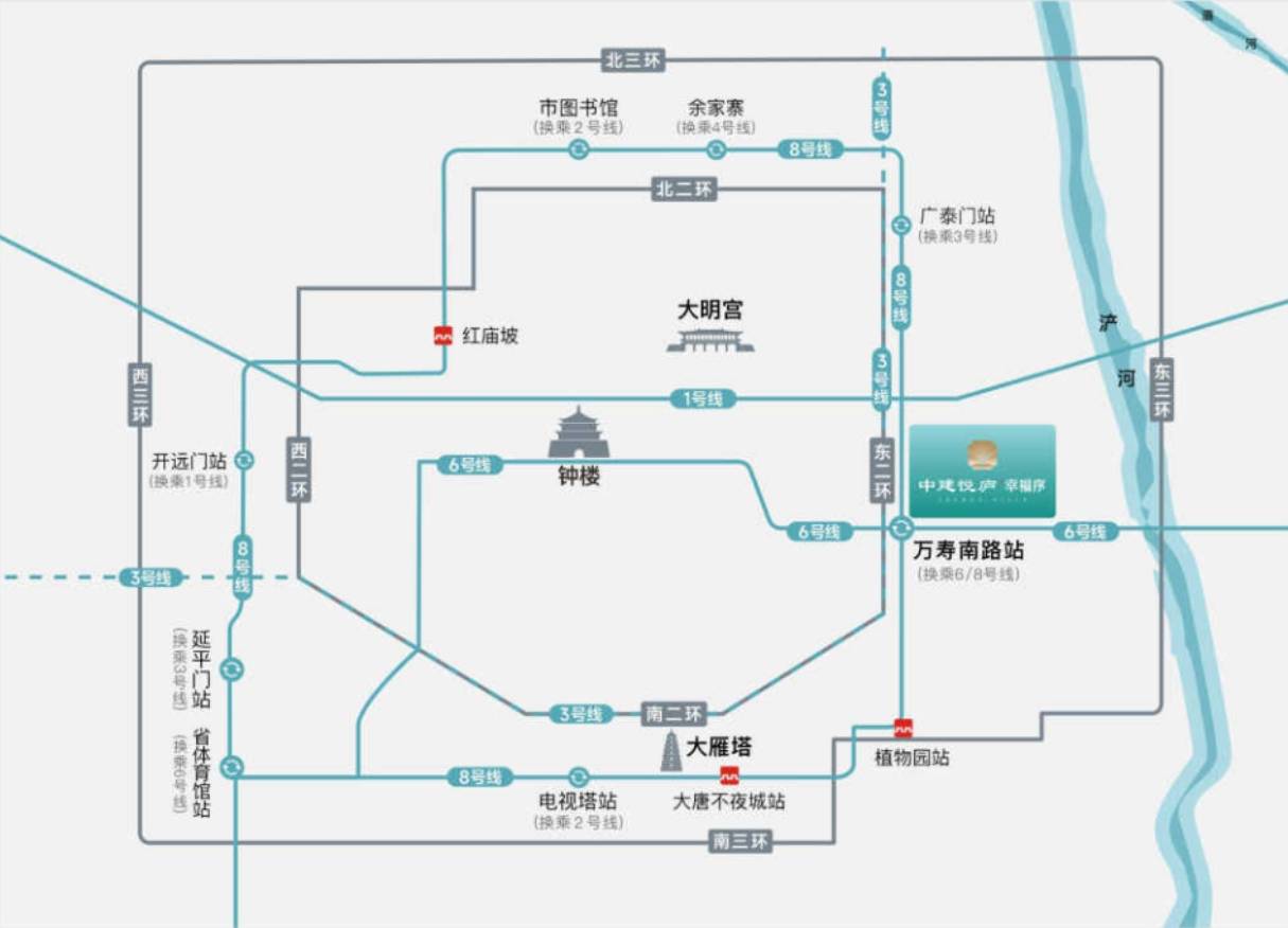 无缝接驳地铁6号线、8号线在中),其中8号线为西安唯一的地铁环线,串联5大主城区。同时项目直连二环及三环,可快速通达全城。