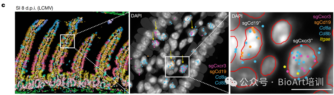 8.3 CD8 T 细胞在组织中的精确位置与细胞核分割及关键转录本信号叠加展示,从而验证基因扰动细胞可在单细胞尺度被空间定位与识别