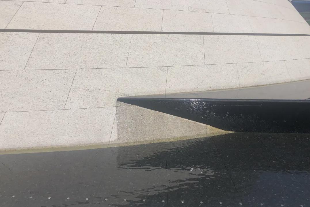 为保证出水均匀平缓成膜,团队还进行:1.施工前核对园建、水电图纸,预留所有管线孔洞、石材开孔。2.水景结构及防水层施工后均进行满水试验。3.所有石材外露面质感一致光面。4.压顶施工前对基层标高核实准确,完成面水平,确保水幕均匀。5.压顶石材采用益胶泥粘贴,专业填缝剂;侧面干挂,防泛碱。6.石材施工前完成六面防护。7.万能支撑器材料质量、安装稳定;石材按留缝尺寸加工。8.施工节点做样板段。
