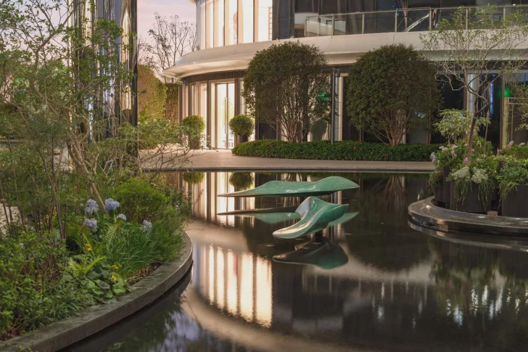 由香樟林道端景转换,叠级绿岛与弧形水景交织而成的酒店式环岛归家仪式,同频国际生活美学。
