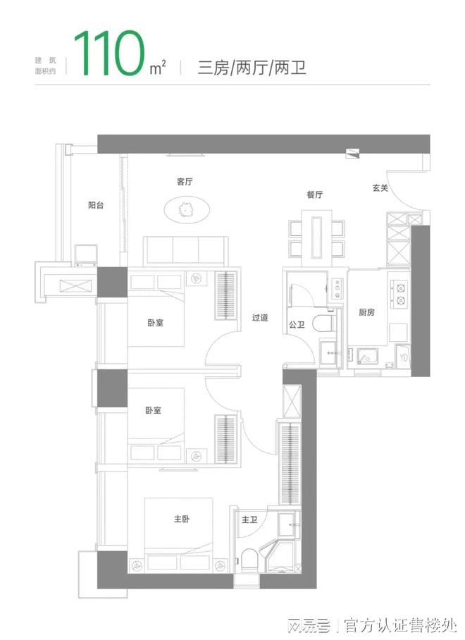 110平三房两厅两卫:入门级三房户型,经典竖厅设计,动静分明、保障隐私。