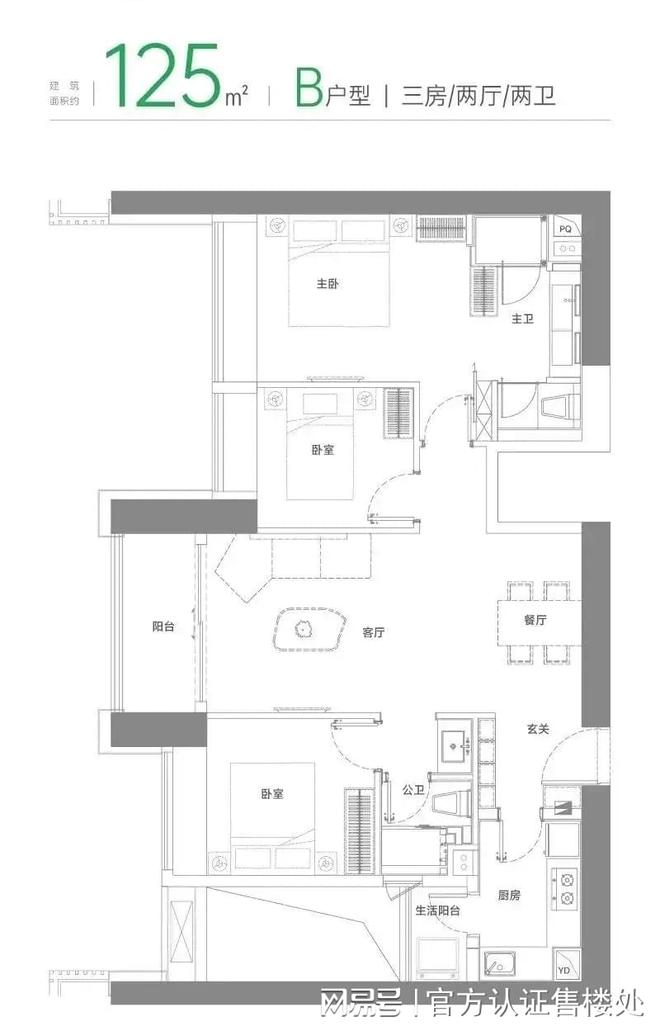 125平三房两卫B户型这个户型有99套,总体和118平格局类似,放大了部分功能区的面积,且增加了一个生活阳台。