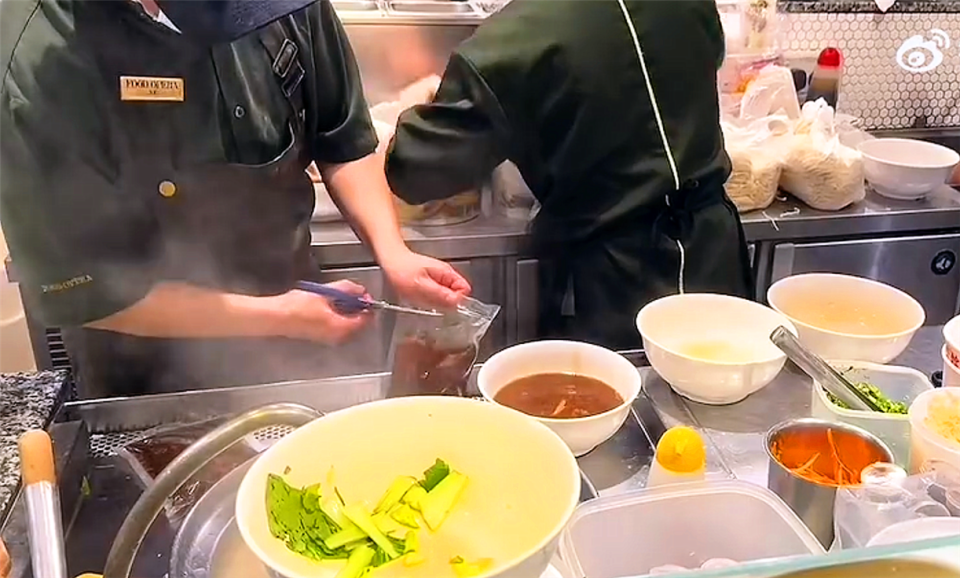 王女士原本是为健康考虑,为了避开预制菜而选择了在和府捞面用餐,结果却亲眼看到后厨令人目瞪口呆的出餐过程。员工娴熟地剪开调料包挤到碗里,然后把煮好的面条放进去,最后再浇上一勺热汤。不过十几秒钟,一碗29元的肥牛面就做好了。