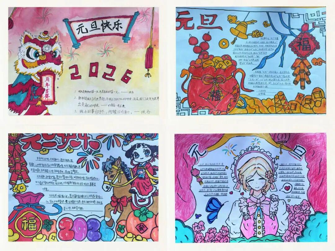 手抄报展区里,一幅幅色彩明丽、创意十足的作品整齐陈列。同学们将节日的喜庆与对新年的祝福融入笔尖:有的以红金为主色调,绘上红灯笼、中国结、烟花等元素,配上“元旦快乐”“新年大吉”的醒目字样,满满都是节日氛围感;有的精心梳理元旦的由来与习俗,用图文并茂的形式科普传统文化知识......每一幅作品都构图精巧、字迹工整,尽显大鹏学子的巧思与才情。