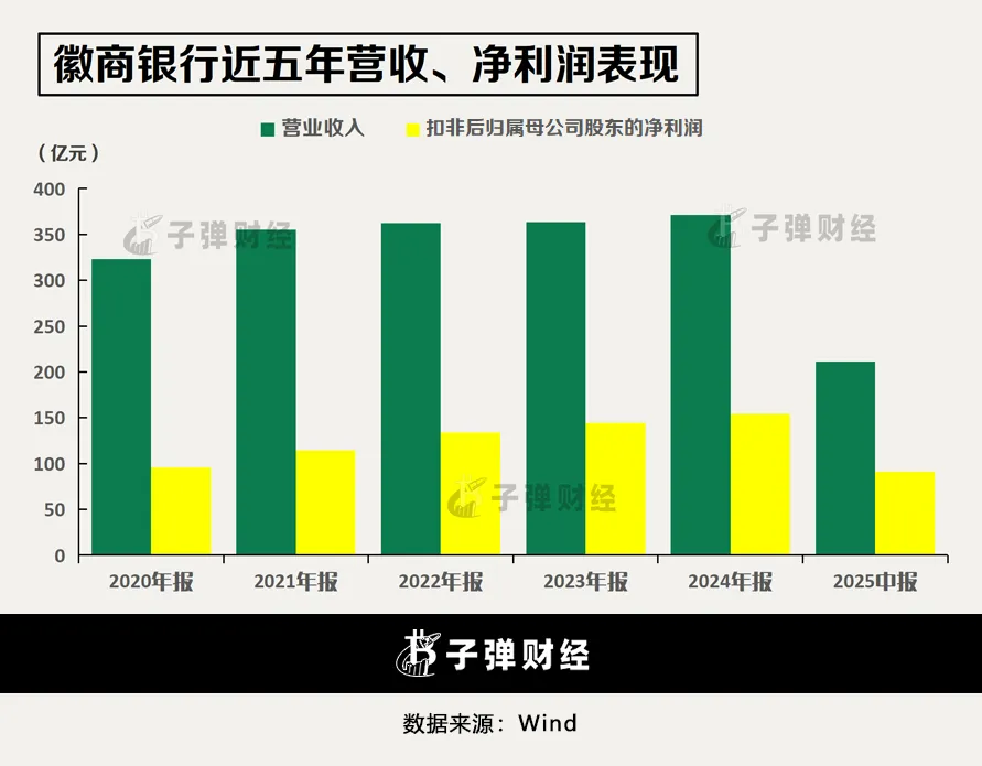 拉长时间线来看,2020年至2024年,徽商银行营业收入分别实现322.90亿元、355.14亿元、362.30亿元、363.65亿元及371.28亿元,同比分别增长3.63%、9.98%、2.02%、0.37%及2.10%。