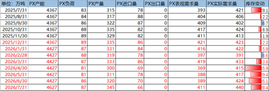 2026年,国内待投产装置共有411万吨,投产增速9.3%。包括福佳大化扩建60万吨,华锦200万吨,九江石化150万吨(有推迟的可能)。从投产时间来看,福佳大化将于今年年底或2026年年初出料,华锦在2026年三季度落地,九江石化要到四季度才能投产,因此全年来看,PX供应压力主要体现在四季度。山东裕龙石化300万吨只能生产MX,尚未拿到PX的生产批文,预计将推迟至2027年。