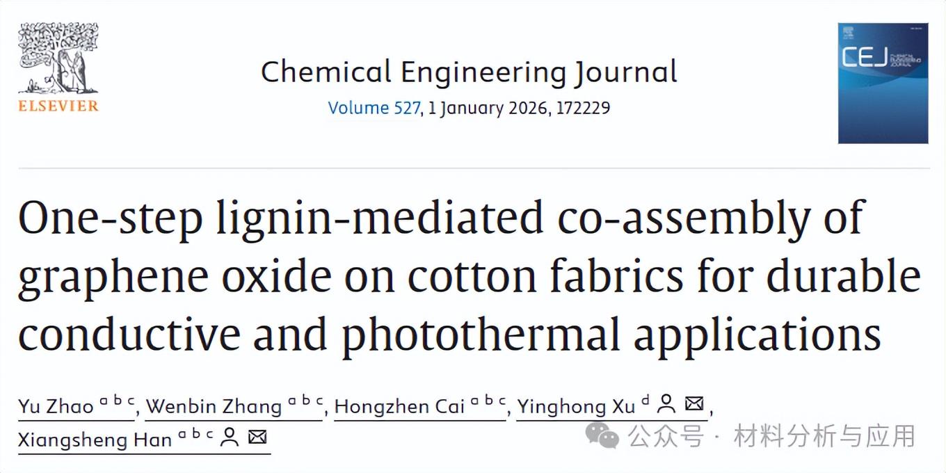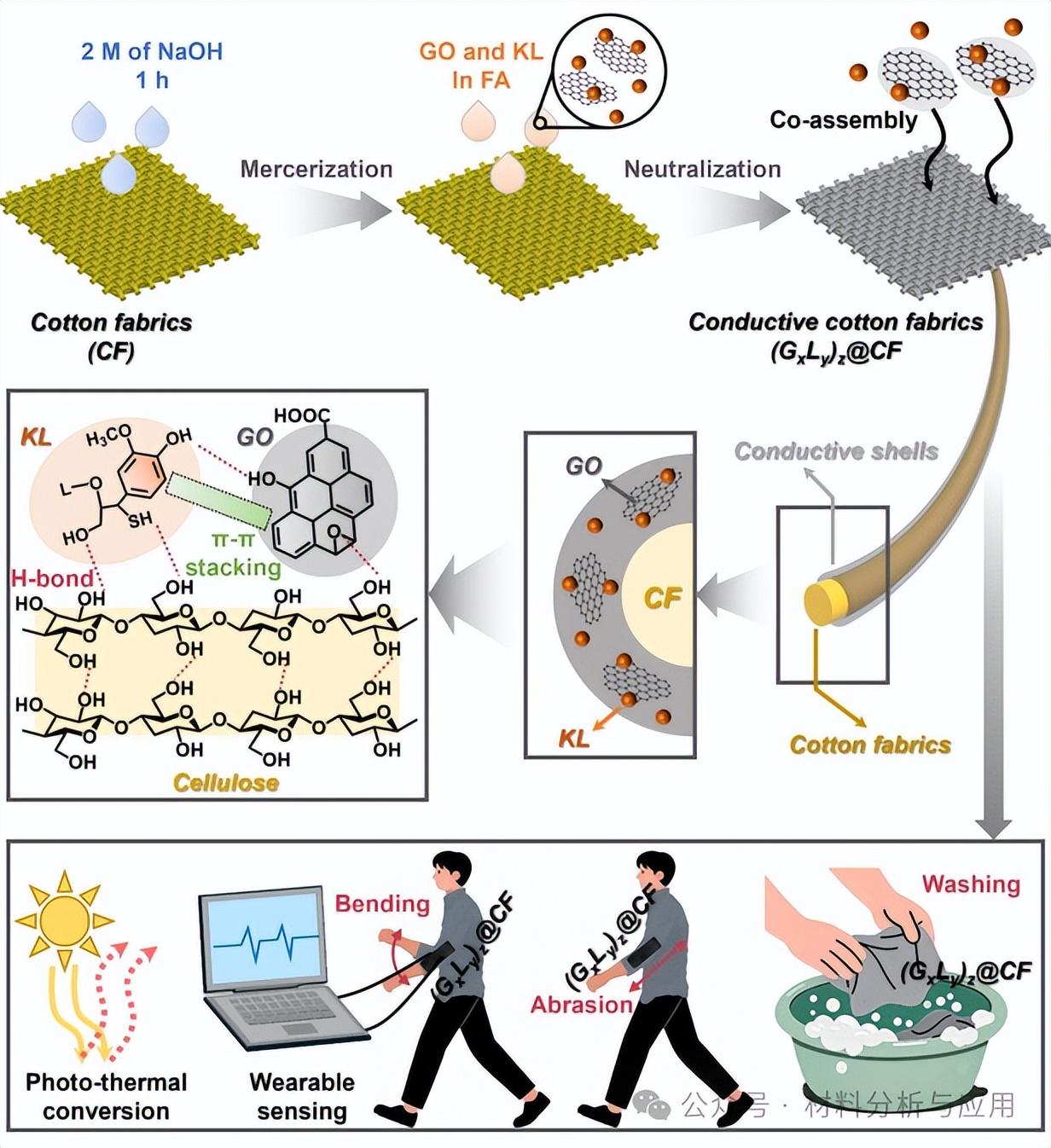 弱界面粘附仍是实现棉质功能性纺织品持久导电性的主要障碍。本文,山东理工大学韩祥生、Yinghong Xu等研究人员在《Chemical Engineering Journal》期刊发表名为“One-step lignin-mediated co-assembly of graphene oxide on cotton fabrics for durable conductive and photothermal applications”的论文,研究提出一种可持续且简便的一步法策略,利用硫酸盐木质素(KL)的固有粘附性在棉纤维表面构建稳定导电层。