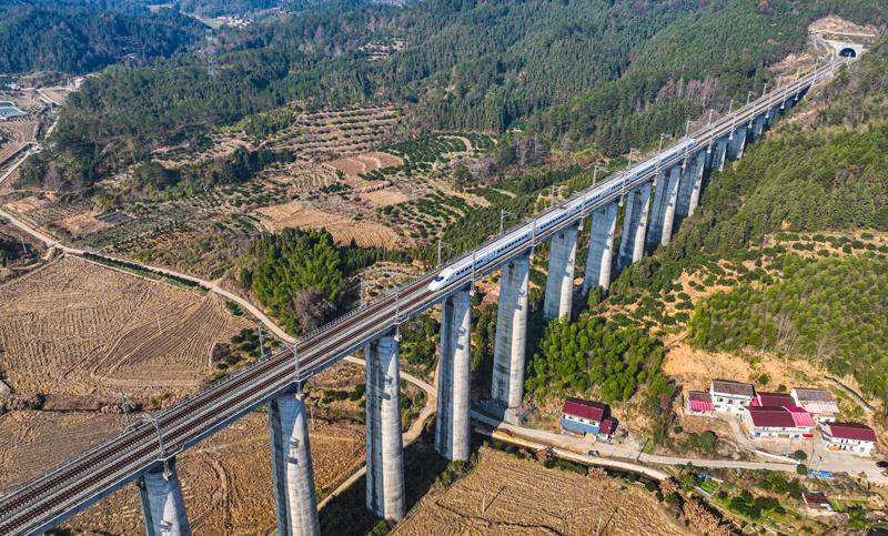 一列动车驶过南丰县太源乡黄家村高架桥。