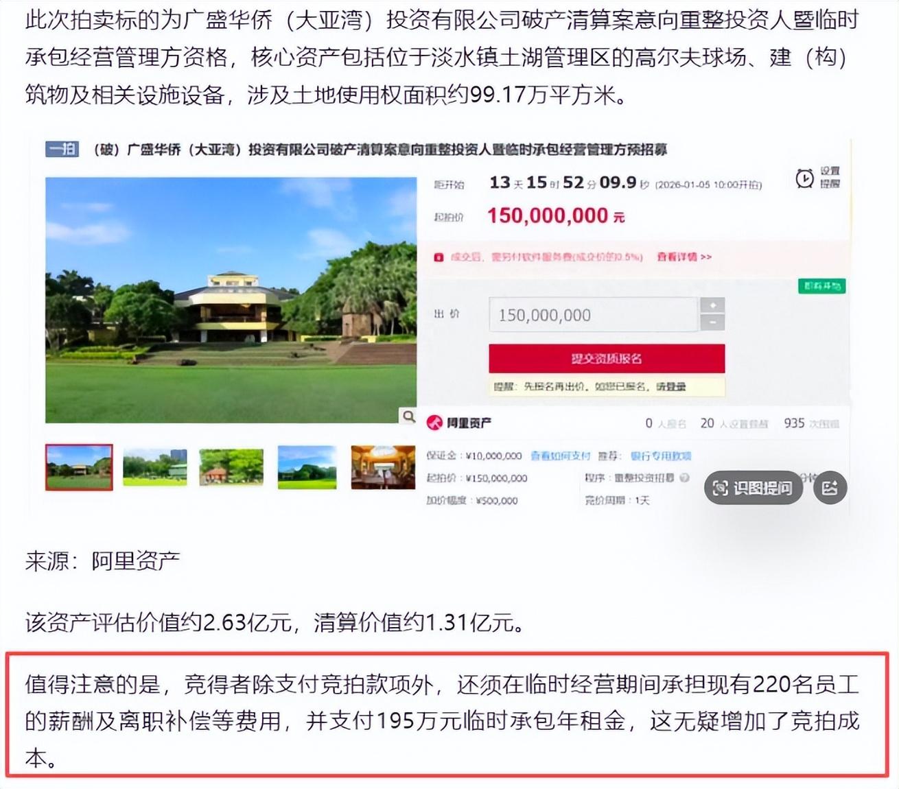 本次拍卖标的包括惠阳棕榈岛高尔夫球场及其附属建筑和设施设备,占地规模接近百万平方米,资产评估价约为2.63亿元人民币,但起拍价仅为1.5亿元。