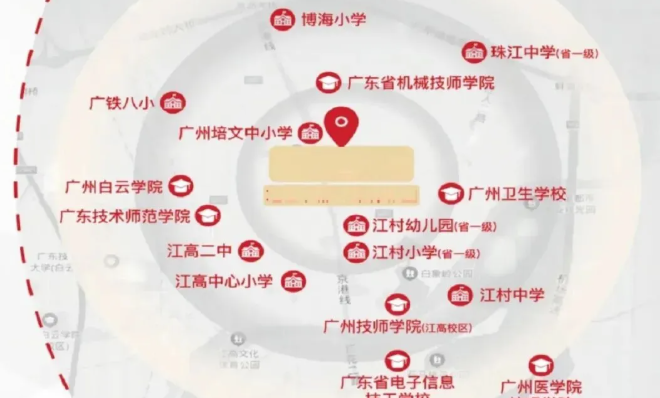 教育配套丰富且优质。项目配建的公立 18 班幼儿园已开学,为幼儿提供启蒙教育。家楼下的国际化北大培文中小学,小学 36 个班,初中 48 个班均已开学,全寄宿制,提供国际化双语教学。其中白云北大培文学校 35% 的小学学位以及 10% 的中学学位作为公办学位供白云区统一安排,采取摇号方式入学,摇不中可选择私立就读,一学期费用约 43,000 元(每年有变动)。周边还有江村小学、两公里外的广铁八小(羊城铁路总公司广州铁路第八小学,人户一致优先),以及江高镇幼儿园(省一级)、江村小学(省一级)、江高镇中心小学、江高二中、江村中学、白云区珠江中学(省一级)等学校,满足全龄段教育需求。