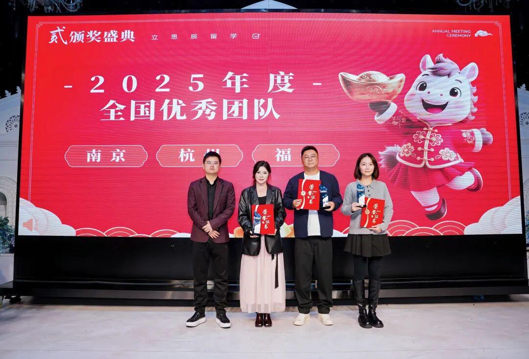 致辞过后,罗成先生为“2025年度全国优秀团队”南京团队、杭州团队、福州团队,以及福州立思辰留学总经理何学治颁发“战略革新突出贡献奖”。沉甸甸的奖项,既是荣誉的见证,更是责任的传承,激励着各团队在新的一年里再创佳绩。