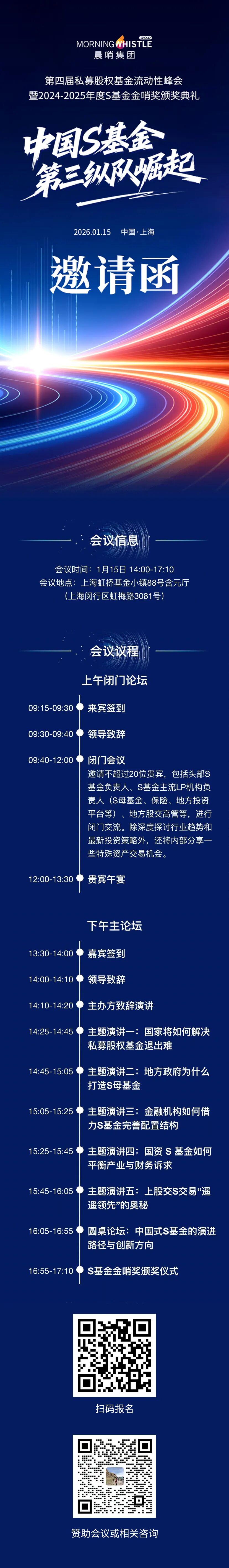 2026年1月15日,晨哨计划举办“第四届私募股权基金流动性峰会”。本次峰会将广泛邀请S市场的主要参与方深入探讨市场最前沿的问题,集思广益地推动市场稳步前行。