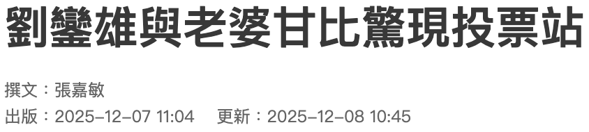▲ 投票期间,大刘全程握紧太太甘比的手,看起来精神尚可;不过他的 身体状况似乎大不如前,下车后便立即坐上轮椅,起身时看起来也颇为吃力。