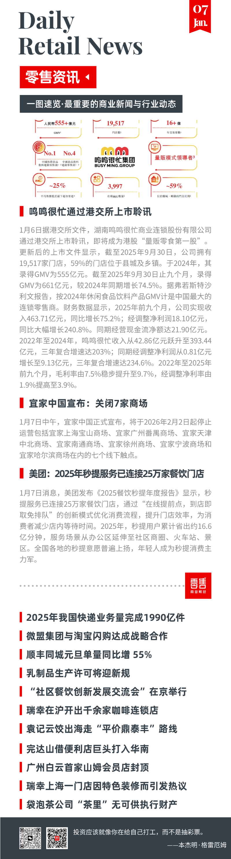 1月6日据港交所文件,湖南鸣鸣很忙商业连锁股份有限公司通过港交所上市聆讯,即将成为港股“量贩零食第一股”。更新后的上市文件显示,截至2025年9月30日,公司拥有19,517家门店,59%的门店位于县城及乡镇。于2024年,其录得GMV为555亿元。截至2025年9月30日止九个月,录得GMV为661亿元,较2024年同期增长74.5%。据弗若斯特沙利文报告,按2024年休闲食品饮料产品GMV计是中国最大的连锁零售商。财务数据显示,2025年前九个月,公司实现收入463.71亿元,同比增长75.2%;经调整净利润18.10亿元,同比大幅增长240.8%。同期经营现金流净额达21.90亿元。2022年至2024年,鸣鸣很忙收入从42.86亿元跃升至393.44亿元,三年复合增速达203%;同期经调整净利润从0.81亿元增长至9.13亿元,三年复合增速达234.6%。2022年至2025年前九个月,毛利率由7.5%稳步提升至9.7%,经调整净利率由1.9%提高至3.9%。