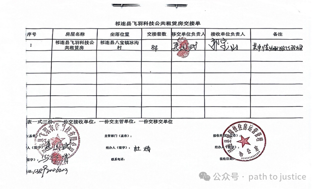 2018年7月10日,在住建局下属保障性住房办公室工作人员杜鹃、贾小军以及马德清的共同见证和交接下,祁连县保障性住房运营管理办公室现场办理了84套公租房的移交手续,并签署移交单。