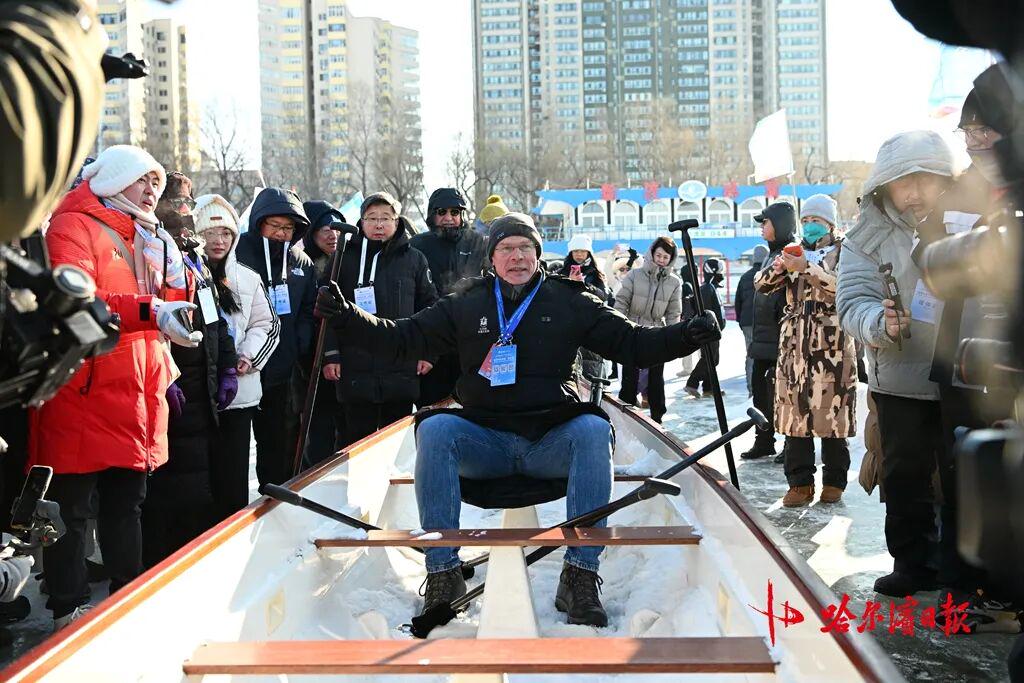 与航天馆的震撼、老街的典雅形成强烈反差,这里是充满生命力的狂欢。嘉宾们在观看了冰上龙舟表演后,纷纷摩拳擦掌跃跃欲试。当他们齐心合力将冰上龙舟划到终点后,情不自禁地振臂欢呼;在另一条冰道上,来自希腊的嘉宾亲自尝试推动冰壶,当冰壶平稳地在场上向前滑动时,大家拍手欢笑……
