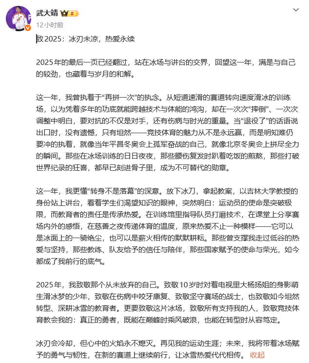 距离2026年冬奥会仅剩一月之际,武大靖官宣了退役的消息。