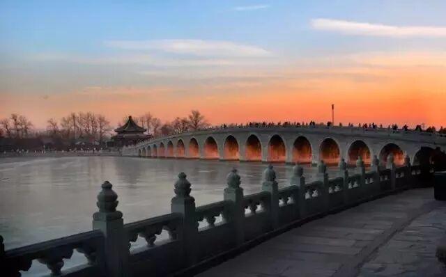 据说,当年,建造颐和园的设计师经过精心计算,使十七孔桥与南回归线的日落点呈垂直状态,