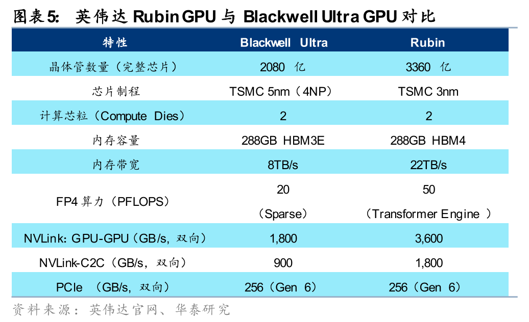 VR平台的6款核心产品包括:1)Rubin GPU配置288GB HBM4,带宽达22TB/s,对比B300的288GB HBM3E,8TB/s带宽。FP4推理能力达50PF(Transformer Engine,对比B300 Sparse的20PF),训练能力35PF。2)Vera CPU采用88个定制Olympus核心(Armv9.2)+空间多线程(SMT)设计,搭配1.5TB LPDDR5X,并以1.8TB/s NVLink C2C链接Rubin GPU。3)NVLink6 Switch将双向互联带宽提升至3.6TB/s(NVLink5为1.8TB/s),VR NVL72机柜总带宽约260TB/s,显著增强机架内部的数据交换能力。在SHARP网络侧计算方面,单个NVLink6 Switch tray可提供约14.4 TFLOPS FP8算力用于通信加速。4)VR NVL72机柜中,每个Compute tray配置四颗ConnectX-9 SuperNIC,为单颗Rubin GPU提供最高约1.6Tb/s的网络带宽;相比之下,GB300 NVL72采用 CX8,网络带宽约为800Gb/s。5)BlueField-4集成64核Grace CPU、128GB LPDDR5X内存与CX9网络,并提供最高800Gb/s超低时延以太网或InfiniBand链接能力。6)Spectrum-6基于200G PAM4 SerDes将单芯片交换带宽提升至102.4Tb/s;英伟达还重申Spectrum-X CPO方案,可实现5倍能效提升。