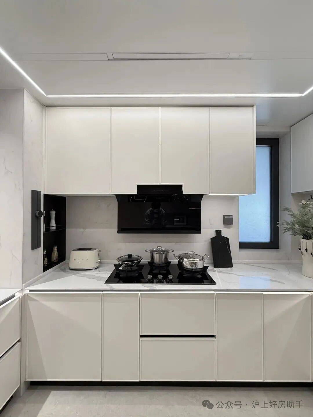 进门可以看到经典的S墙设计,L型厨房操作台面,也是暗藏不少细节——玻璃移门采用完美系列夹丝玻璃+金属造型边框,顶部配置线性凉霸+LED嵌入式回形灯带+筒灯,灶台后侧采用大面积岩板铺设,方便清洁的同时显得厨房更加大气。