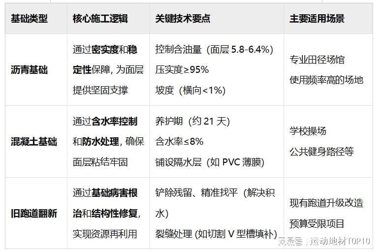 不同基础条件下铺设塑胶跑道,确实需要“因地制宜”的施工方案和对策。下面这个表格梳理了三种典型基础的核心施工逻辑,可以帮助你快速把握要点。