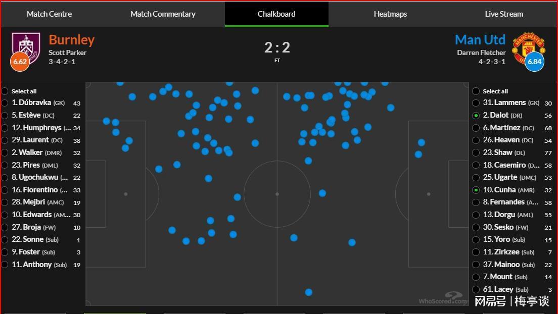 曼联虽然强化了左路进攻,可是左路大量控球,也是导致丢失球权比较严重的区域,从左路快推到中路、右路,直接打穿曼联的肋部,伯恩利这场比赛就没少做这样的事情,他们的34次拦截中,你看看多少是位于曼联的左肋部的?