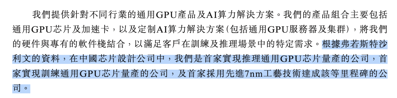 根据弗若斯特沙利文的资料,在中国芯片设计公司中,天数智芯是首家实现推理通用GPU芯片量产的公司,首家实现训练通用GPU芯片量产的公司,及首家采用先进7nm工艺技术达成该等里程碑的公司。