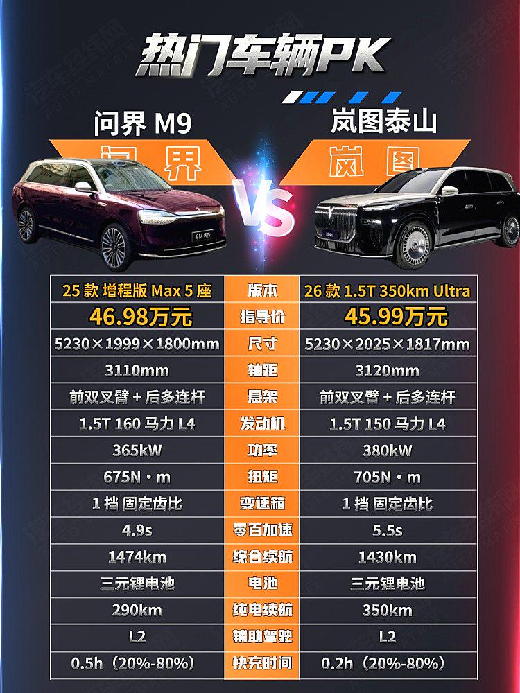 问界 M9 胜在鸿蒙生态、昆仑 ADS 的成熟智能与 5 座豪华体验,岚图泰山赢在空间、续航、快充的硬核参数与6座实用性。二者均有华为加持,50 万预算,你是偏科技体验还是务实配置?