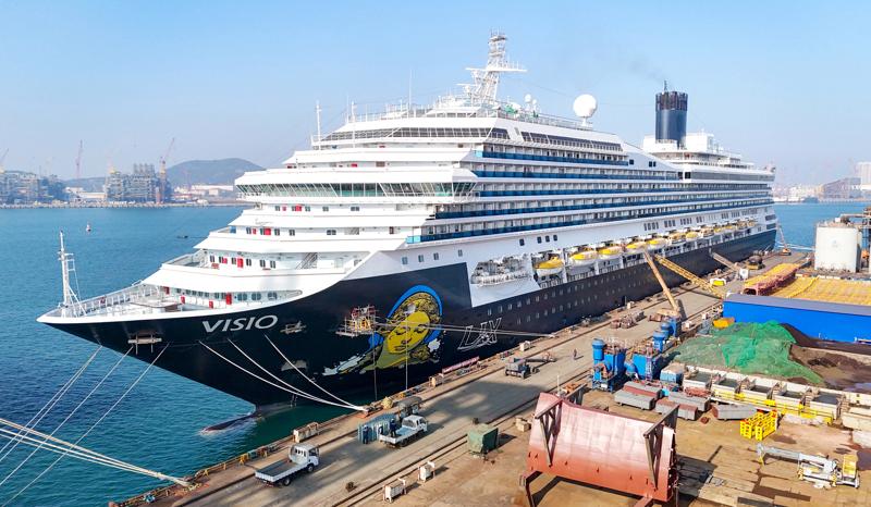 1月7日,“理想”号邮轮在中国船舶集团青岛北海造船有限公司厂区开展常规修理。“理想”号邮轮是来自意大利芬坎蒂尼船厂的10.3万总吨邮轮。
