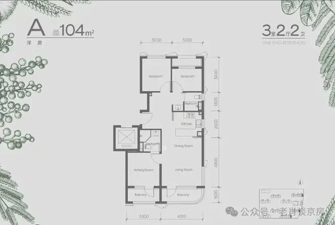 建面约104平三居,3室2厅2卫,阳台和客厅侧开窗户,与南侧、东侧中海代建的约1.2万方环绕绿地呼应,视野体验更开阔舒展。