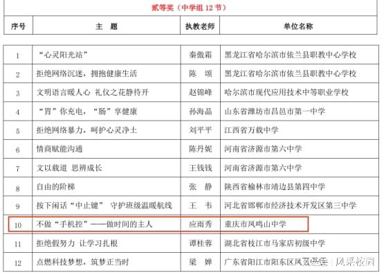 近日,由全国名班主任工作室联盟、星领雁教育智库及国家级德育主流媒体《德育报》联合主办的第四届全国中小学(含中职)微班会大赛决赛评审结果正式揭晓。本届大赛覆盖全国20个省(直辖市),收稿量达893份,经海选、半决赛、总决赛三级严格评审,最终评选出中学组获奖教师29名。其中,重庆市凤鸣山中学凤鸣班主任工作室的袁泉老师荣获全国一等奖,应雨秀老师斩获全国二等奖。
