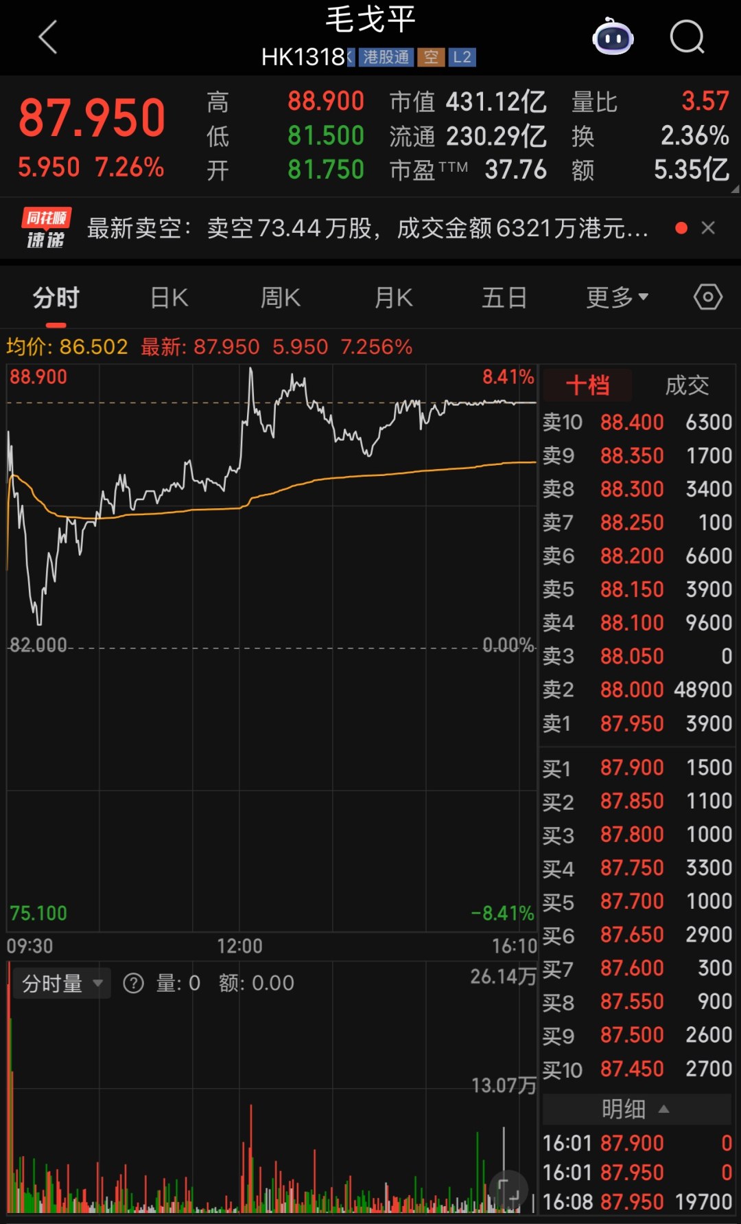 1月7日,毛戈平股价高开低走,随后强势反弹,最高涨幅8.41%,截至收盘,股价报87.95港元,涨幅7.26%。以当天公司收盘价计算,上述股东拟套现15.1亿港元(折合人民币13.6亿元)。