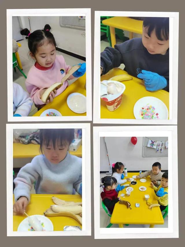 教室里,孩子们围坐在桌子旁,桌上摆放着香蕉、酸奶、彩虹糖和奥利奥碎等材料。老师协助孩子们将香蕉切成小段,孩子们小心翼翼地为香蕉裹上酸奶,再根据自己的喜好撒上五颜六色的彩虹糖或香脆的奥利奥碎,制作出独一无二的香蕉棒。