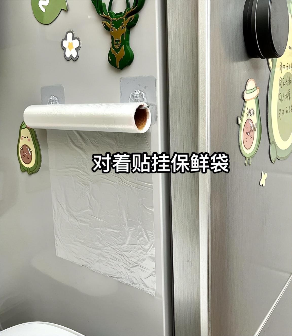 只需要两个挂钩,对着粘贴起来,就可以把保鲜膜收纳好了。