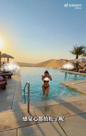 伊能静还趁着日落余晖,在沙漠中拍下美照,头上披着丝巾的她流露出异国风情,随后才换上泳装,在与沙漠相连的无边际泳池中戏水。她形容在沙漠与水源这种矛盾的组合中游泳,感觉特别不同,且身心都得到了放松,「连游泳都变得好浪漫。」
